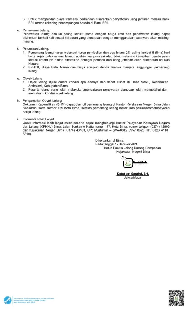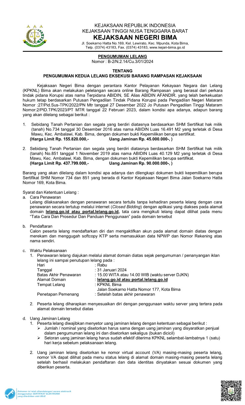 Kejaksaan Negeri Bima dengan Perantara Kantor Pelayanan Kekayaan Negara dan Lelang (KPKNL Bima) akan melakukan pelelangan secara online Barang Rampasan yang berasal dari Tindak Pidan Korupsi an. Terpidana ABIDIN, SE Alias ABIDIN AFANDIR yang telah berkekuatan hukum tetap berdasarkan Putusan Pengadilan Tindak Pidana Korupsi pada Pengadilan Negeri Mataram Nomor :27/Pid.Sus-TPK/2022/PN Mtr tanggal 27 Desember 2022 Jo Putusan Pengadilan Tinggi Mataram Nomor :2/PID.TPK/2023/PT MTR Tanggal 22 Februari 2023, dalam kondisi apa adanya.