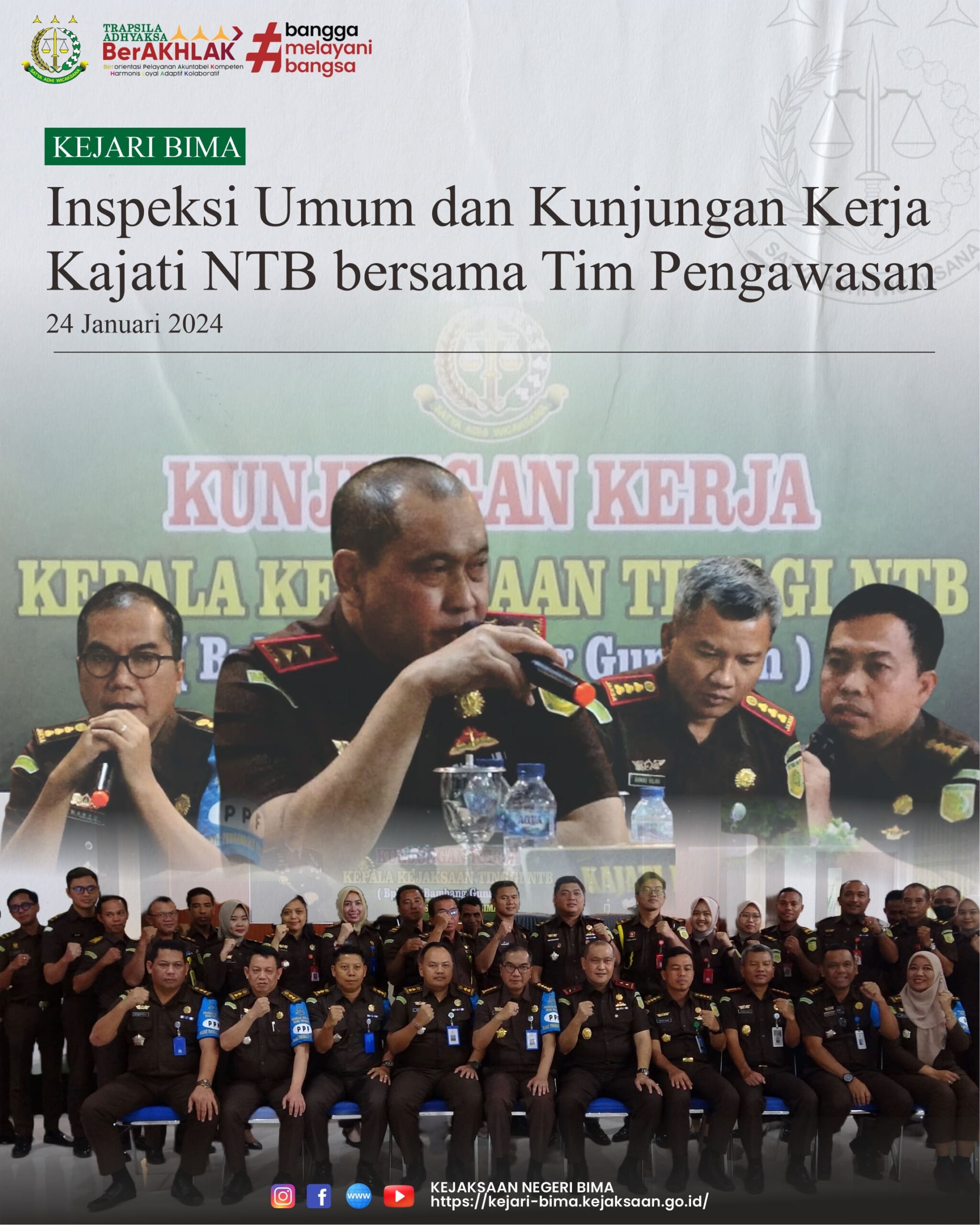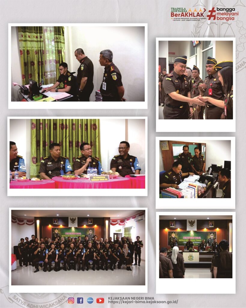 pada hari Rabu, 24 Januari 2024 bertempat di Kantor Kejaksaan Negeri Bima telah dilaksanakan Inspeksi Umum dan Kunjungan Kerja Kepala Kejaksaan Tinggi Nusa Tenggara Barat Dr. Bambang Gunawan didampingi oleh Asisten Intelijen I Wayan Riana, S.H., M.H. dan Asisten Pengawasan Wahyu Triatono, S.H., M.H,.