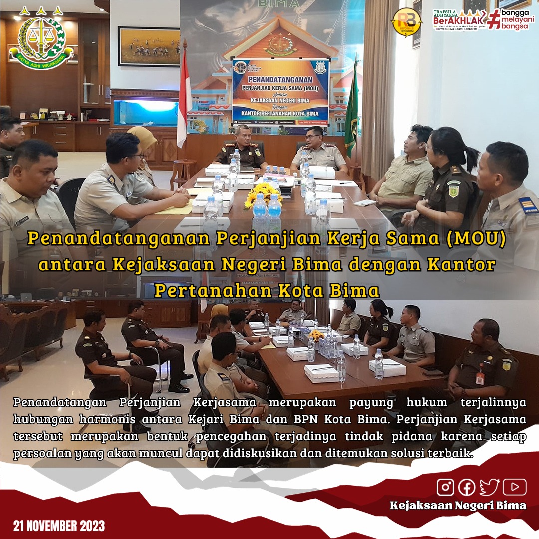 Selasa 21 November 2023 telah dilaksanakan Penandatanganan Perjanjian Kerja Sama (MOU) antara Kejaksaan Negeri Bima dengan Kantor Pertanahan Kota Bima.