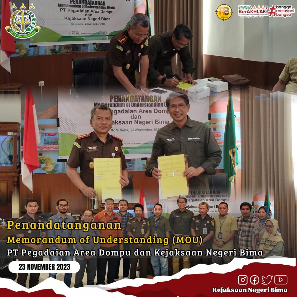 Pada Hari Kamis tanggal 23 November 2023 bertempat di Kejaksaan Negeri Bima, telah dilaksanakan Penandatanganan Memorandum of Understanding (MOU) antara PT Pegadaian Area Dompu dan Kejaksaan Negeri Bima.
