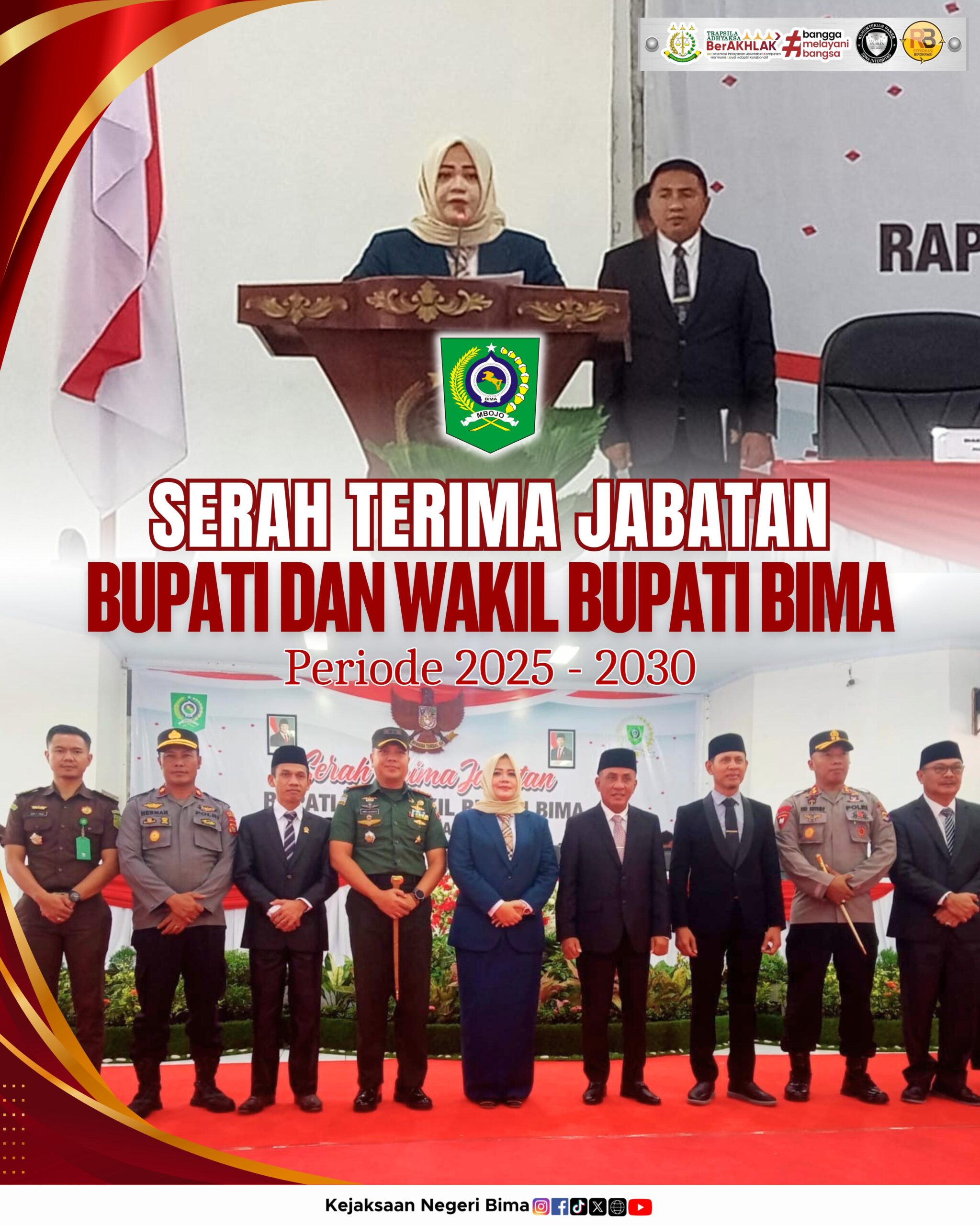 Kepala Seksi Intelijen Kejaksaan Negeri Bima mewakili Kejaksaan Negeri Bima dalam acara Serah Terima Jabatan (Sertijab) Bupati dan Wakil Bupati Kabupaten Bima terpilih periode 2025-2030. Serah terima dilakukan dari pasangan Bupati/Wakil Bupati Periode sebelumnya, Indah Damayanthi Putri dan Dahlan M. Noer kepada Bupati/Wakil Bupati periode 2025-2030, Adi Mahyudi dan dr. Irfan.