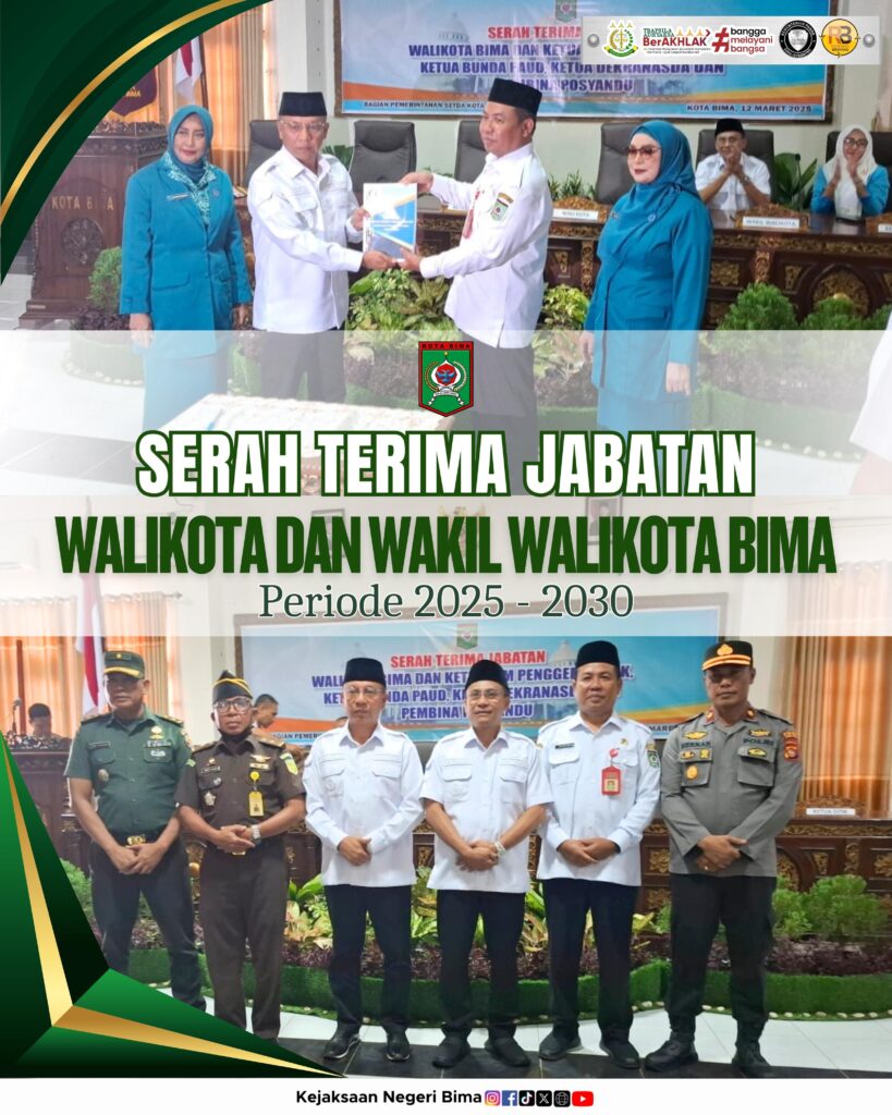 Kepala Sub Bagian Pembinaan Kejaksaan Negeri Bima mewakili Kejaksaan Negeri Bima dalam acara Serah Terima Jabatan (Sertijab) Walikota dan Wakil Walikota Kota Bima terpilih periode 2025-2030. Serah terima dilakukan dari PJ Walikota Kota Bima, H. Mukhtar kepada Walikota/Wakil Walikota terpilih periode 2025-2030, H. A. Rahman dan Feri Sofiyan.